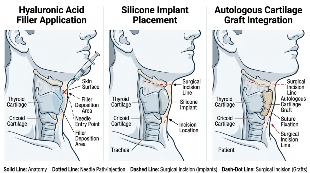 When researching how to get adam’s apple results, most patients overlook autologous grafts — the gold standard at Dr. MFO Clinic, where 100% of grafts integrate without rejection. Three primary techniques dominate clinical practice, each with distinct trade-offs in permanence, recovery, and risk.