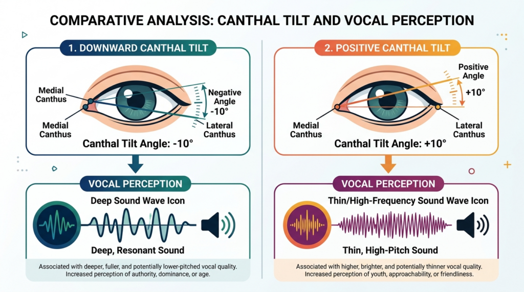 Canthal tilt is measured as the angle between the inner canthus (inner eye corner) and outer canthus (outer eye corner). Positive tilt: outer corner higher than inner (common in feminine faces). Neutral tilt: inner and outer corners level. Downward tilt: outer corner lower than inner (common in masculine faces). The steeper the downward tilt, the more the brain expects a lower vocal pitch.
