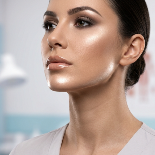 85 mm lensle çekilmiş, hiper gerçekçi, 8K çözünürlükte bir editoryal portre; steril, modern bir diş kliniğinde merkezde konumlanmış, sakin ve profesyonel bir duruş sergileyen bir kadını gösteriyor. Yumuşak ve dağınık aydınlatma, teninde hoş ve doğal bir ışıltı yaratırken, yüzünün yumuşak hatlarını ve zarif çene hattını incelikle vurguluyor. Cilt dokusu kusursuz bir hassasiyetle işlenmiş olup, gerçekçi mikro detaylarla sağlıklı, nemli bir ışıltı sergiliyor. İnce örgü kumaştan yapılmış şık, koyu tonlu yüksek yakalı bir giysi giymiş olması, sofistike bir kontrast sağlıyor. Kompozisyon, sığ bir alan derinliği kullanarak özneyi net bir şekilde odaklarken, arka planı (3D tanısal kafatası ve çene kemiği dijital görüntüleme ekranlarına sahip klinik bir ortam) yumuşak bir şekilde bulanıklaştırarak, gelişmiş teknolojik hassasiyet ve üst düzey tıbbi uzmanlık atmosferini çağrıştırıyor.